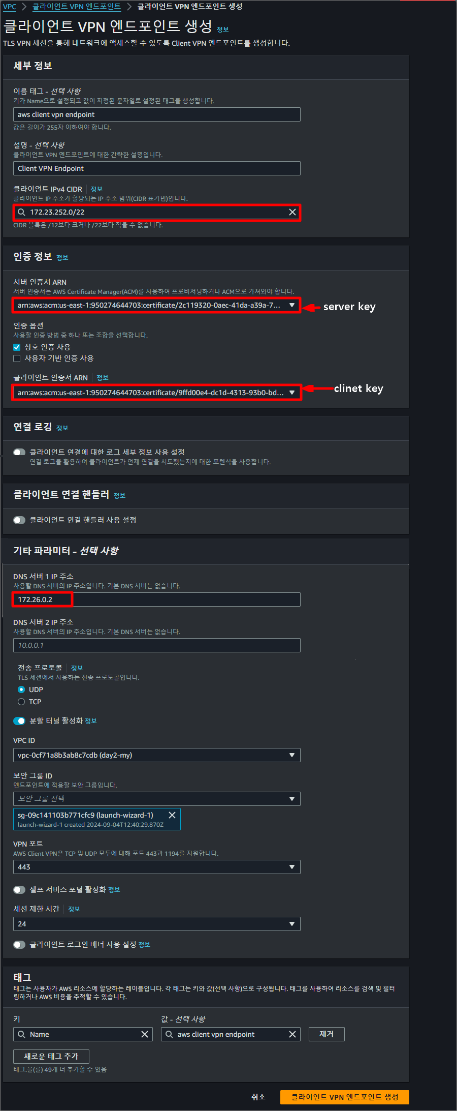 DNS 서버 주소는 client vpn과 연결하고, DNS에 접근을 하고 싶으시다면 VPC CIDR에 +2 해주시면 됩니다. (이 값은 VPC의 Route53 주소입니다.)