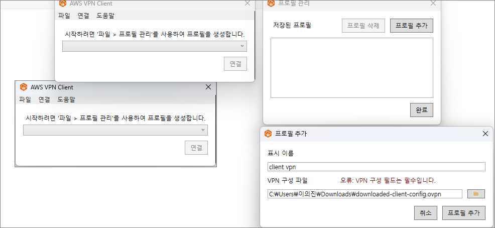파일 -> 프로필 관리 -> 프로필 추가하여 표시 이름을 적고 VPN 구성 파일을 넣습니다.