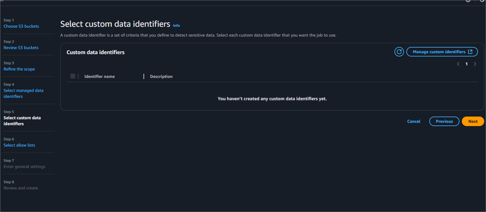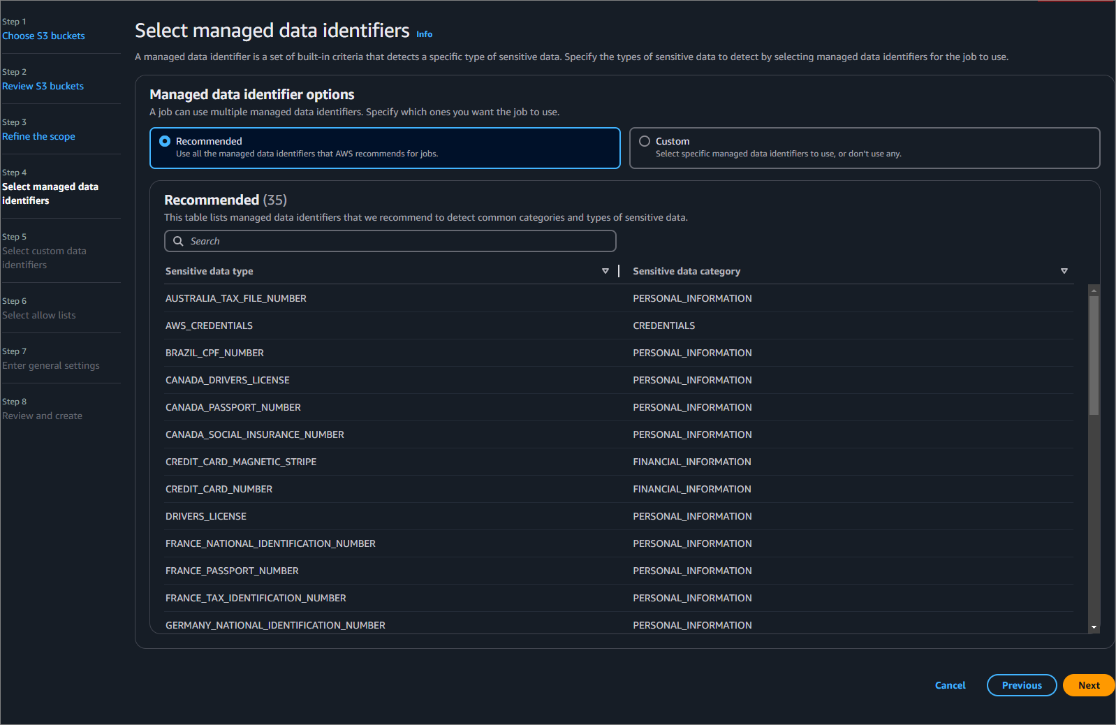 여기서 Recommended를 선택하게 되면 AWS에서 제공하는 표준 관리 데이터 식별자(Managed Data Identifiers)의 추천 세트를 사용할 수 있습니다.