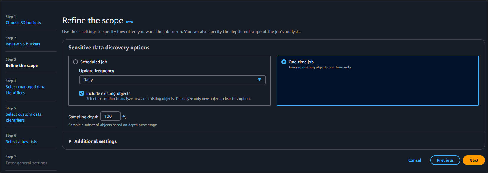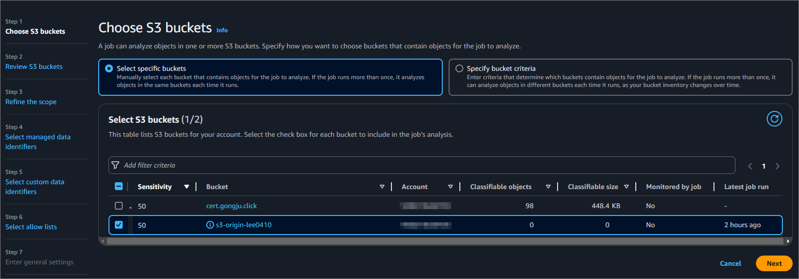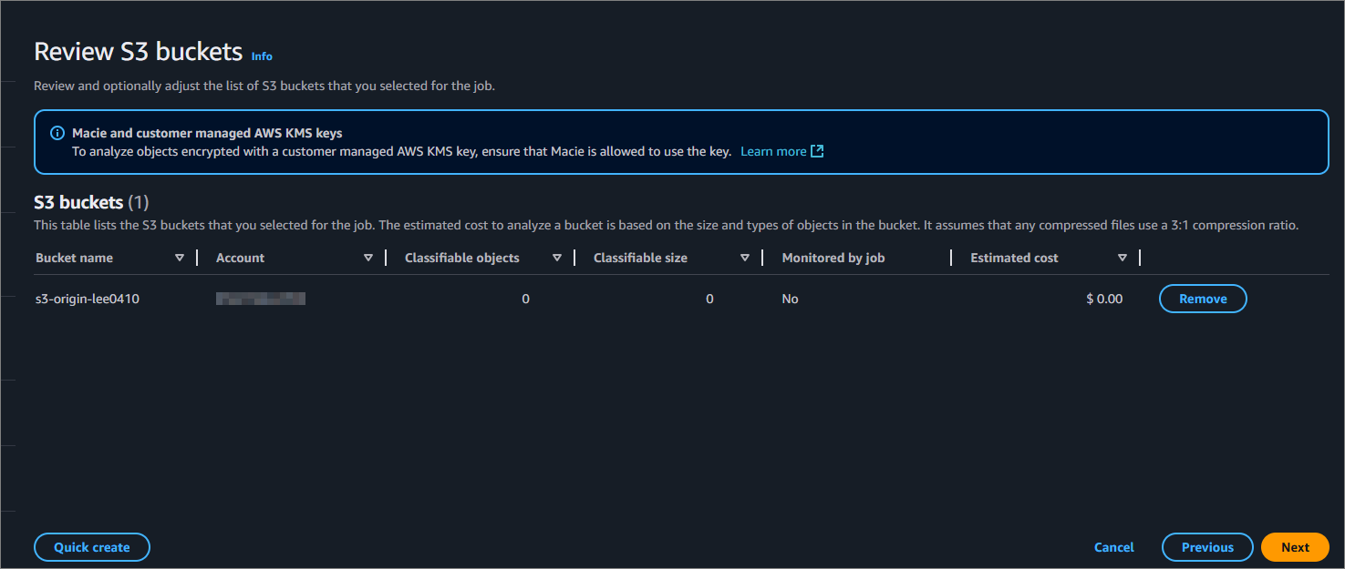 여기서 조회할 S3 Bucket을 선택합니다. 저는 민감한 데이터와 민감하지 않은 데이터가 존재하는 S3 Bucket을 선택했습니다.