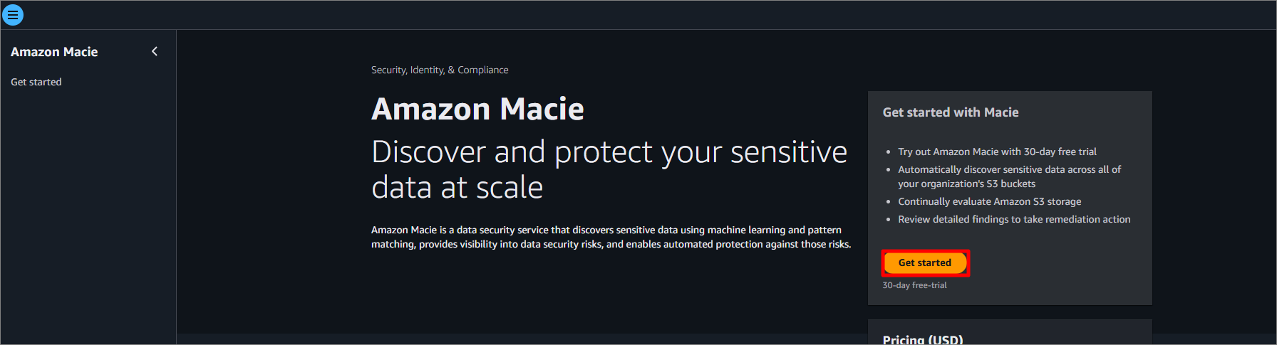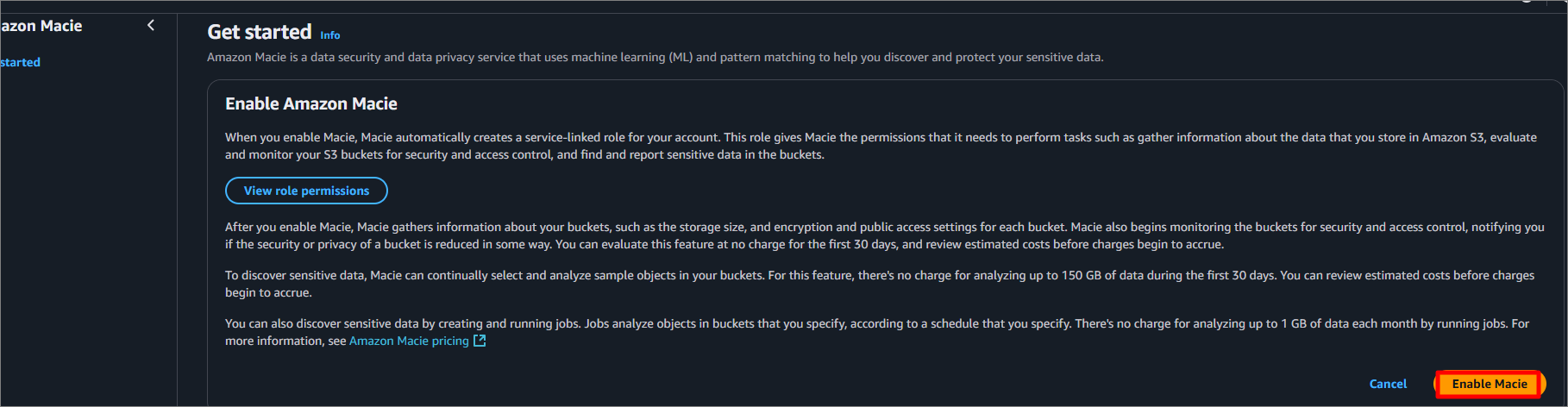 업로드하였다면 Macie에 접속하여 Macie를 활성화해 줍니다.