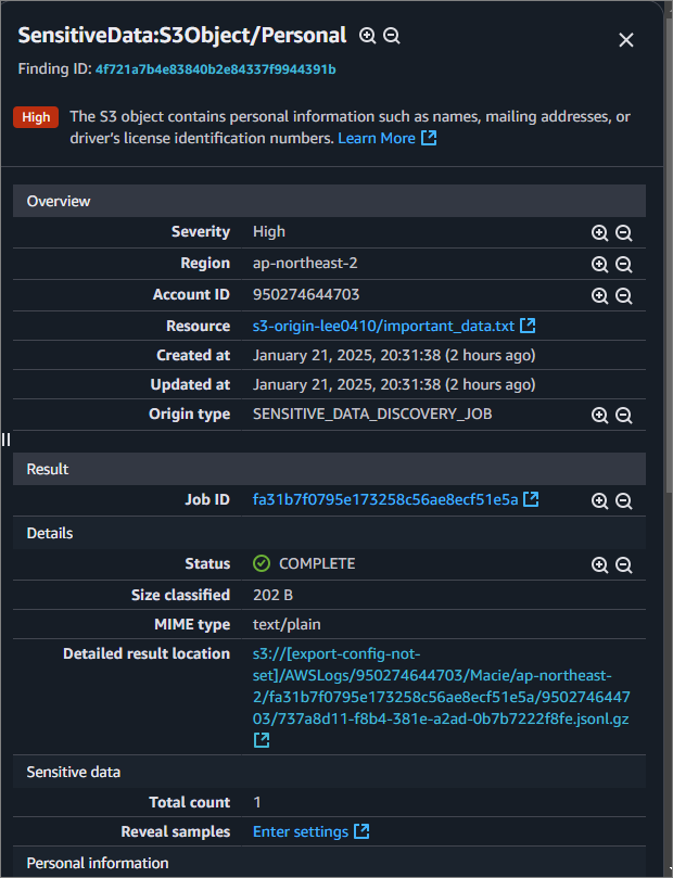 Findings에서 민감한 데이터를 감지했는지 확인합니다. 정상적으로 처리했으며, 중요한 정보가 담긴 txt 파일만 위험하다고 알려줍니다. 또한 클릭을 하면 자세한 정보도 나옵니다.