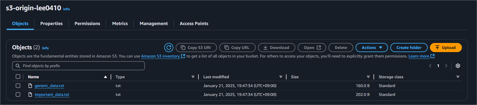위와 같이 bucket을 먼저 생성합니다. 생성하고 테스트를 위해서 민감한 데이터가 담긴 파일과 민감한 데이터가 담기지 않은 파일을 업로드해 봅시다.