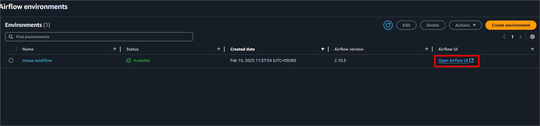 AWS 콘솔에서 MWAA 환경을 생성합니다.