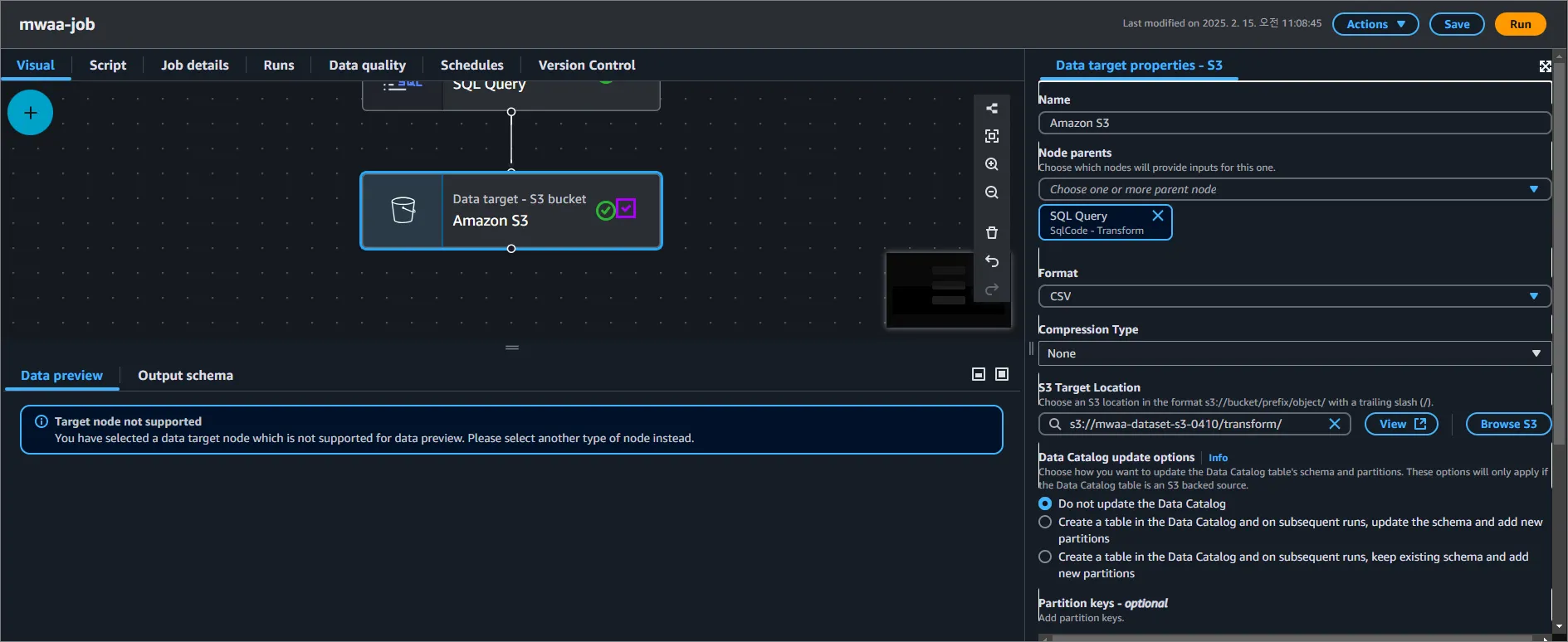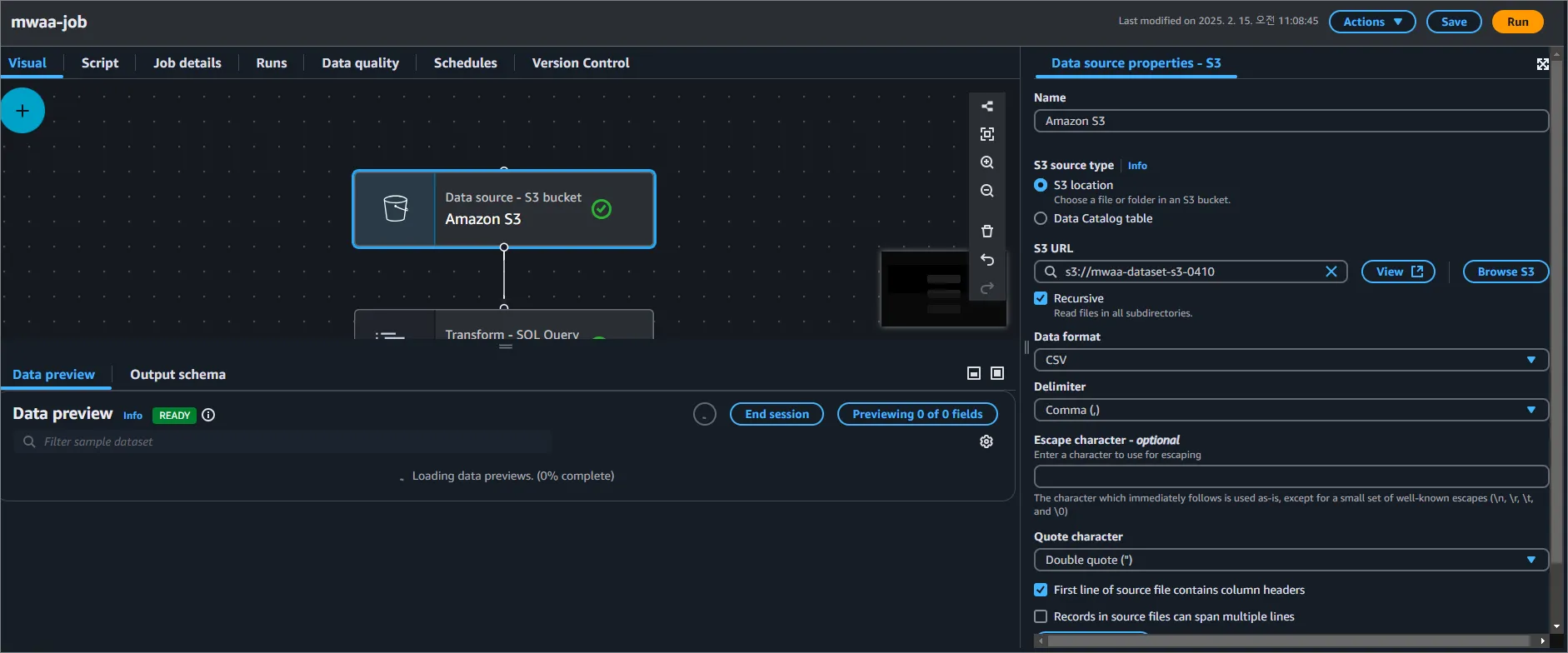 - mwaa-dataset-s3: 처리할 CSV 파일을 업로드할 데이터셋 저장소로 사용됩니다.