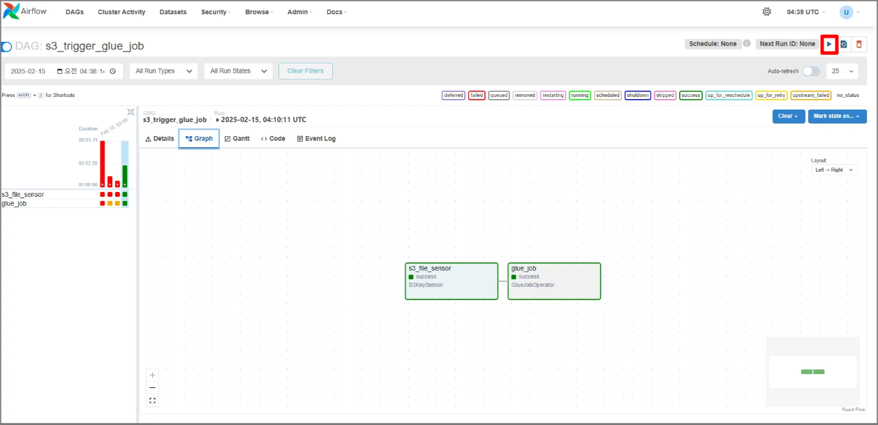 Airflow UI에 접속하여 DAG를 트리거합니다. "Trigger DAG" 버튼을 클릭하여 DAG를 실행합니다.
