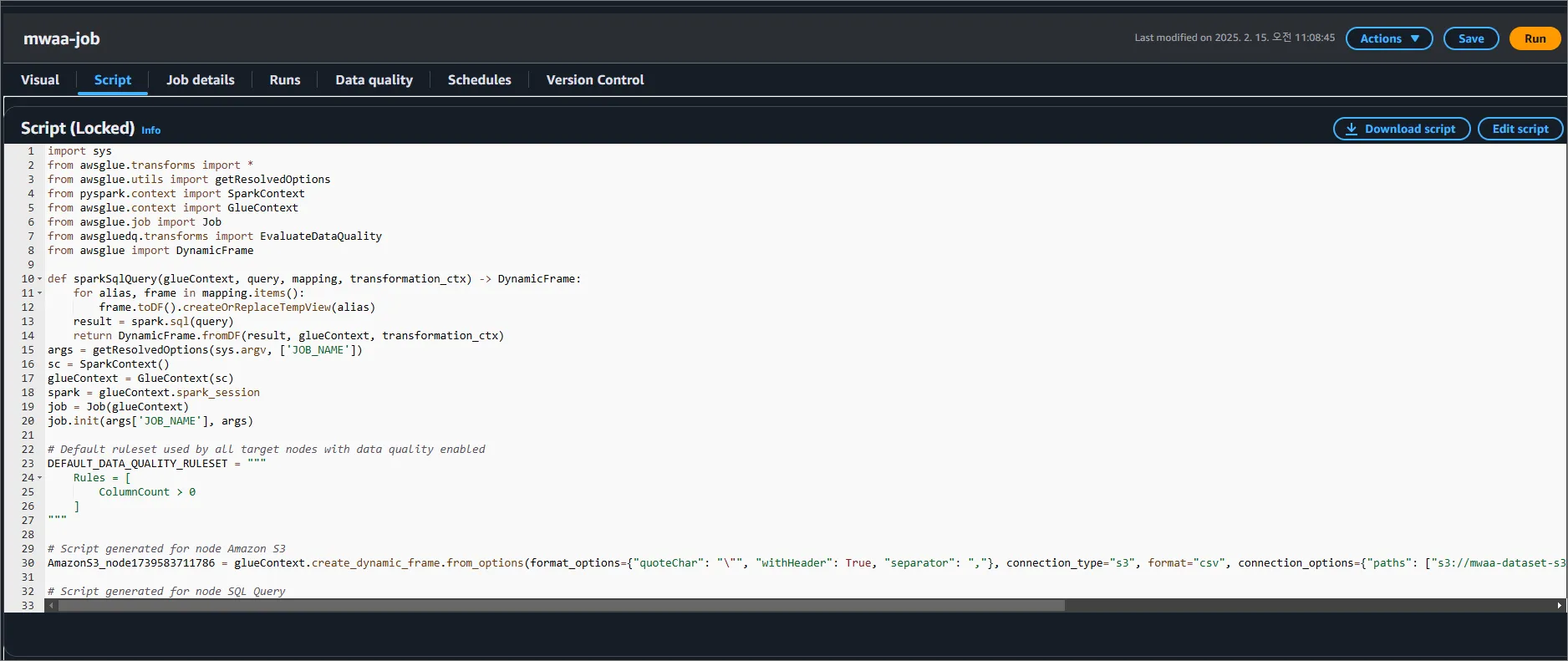 AWS Glue에서 생성한 스크립트를 Bastion 호스트의 /scripts/glue.py에 저장합니다. 이 스크립트는 MWAA에서 트리거될 Glue 작업을 정의합니다.