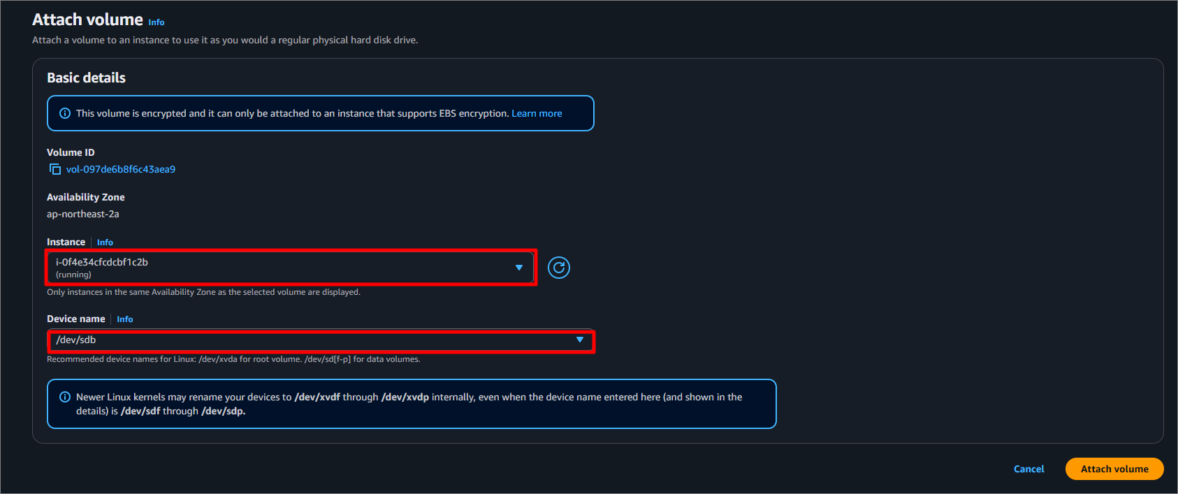 원하는 Instance를 선택하고 Device name을 선택 후 Attach 합니다.