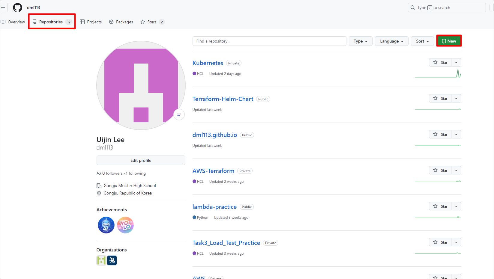 Repositories -> New 클릭하여 생성 페이지로 넘어갑니다.