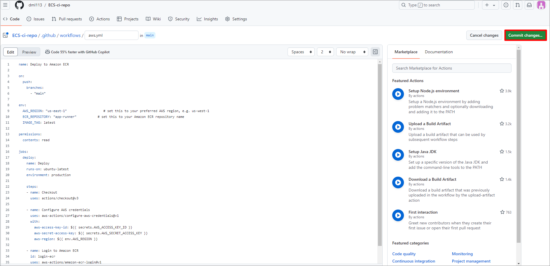생성 페이지로 넘어가면 .github/workflows/aws.yml라고 적으시고, 아래 code를 복사하여 넣은 후 commit changes를 클릭하여 파일을 생성해주면 됩니다. code에 주석을 확인하여 자신의 값으로 변경해야 합니다. 참고로 ECR Repository는 자신이 원하는 이름으로 미리 생성해두셔야 합니다. ECR Repository를 생성하는 방법은 간단하기 때문에 따로 정리해두지 않겠습니다.